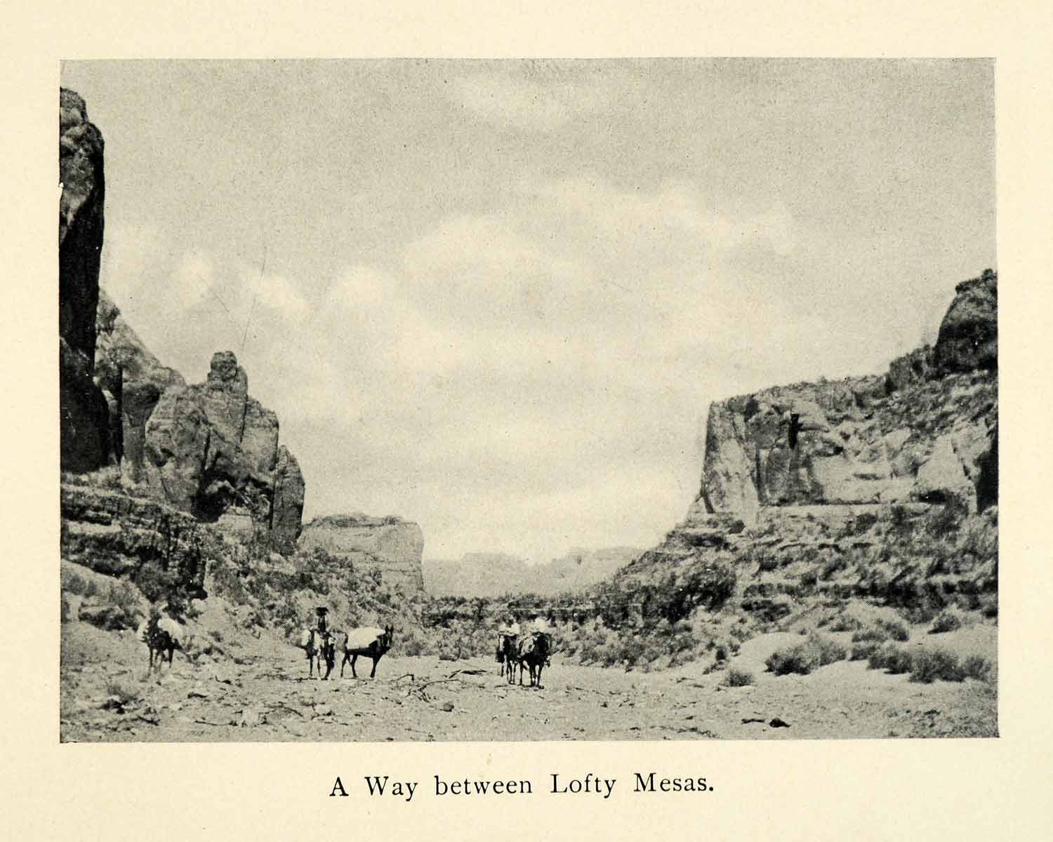 This is an original 1906 halftone print of travelers in between two Mesas- flat, table mountains in the Great Plains of America. The Great Plains are a broad expanse of flat land, mostly grassland and prairie, that lies between the Mississippi River and the Rocky Mountains. This area also refers to the land used by the Plains Indians.