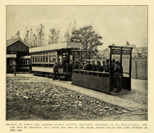 This is an original 1906 halftone print of a street car box attached to a passenger train, which is meant to prevent overcrowding. This method was designed by the London County Council.