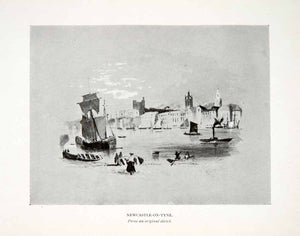 This is an original 1906 black and white halftone print of Newcastle upon Tyne which is a city located in northeast England. The original sketch in this print was created by Myles Birket Foster (1825-1899) who was an English watercolor artist and illustrator. He was born in North Shields, England, to a Quaker family. Foster was apprenticed to a wood engraver named Ebenezer Landells in London and worked as an illustrator for books and periodicals. He is also known for his landscapes which he painted as he traveled throughout Europe.