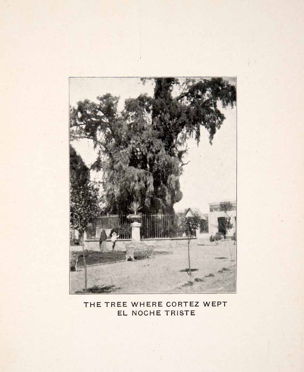 This is an original 1906 black and white halftone print of the tree where Hernán Cortés wept after the death of the Aztec king Montezuma when Cortez and his army escaped from Tenochtitlan during the time of the Spanish Conquest of Mexico in 1520.