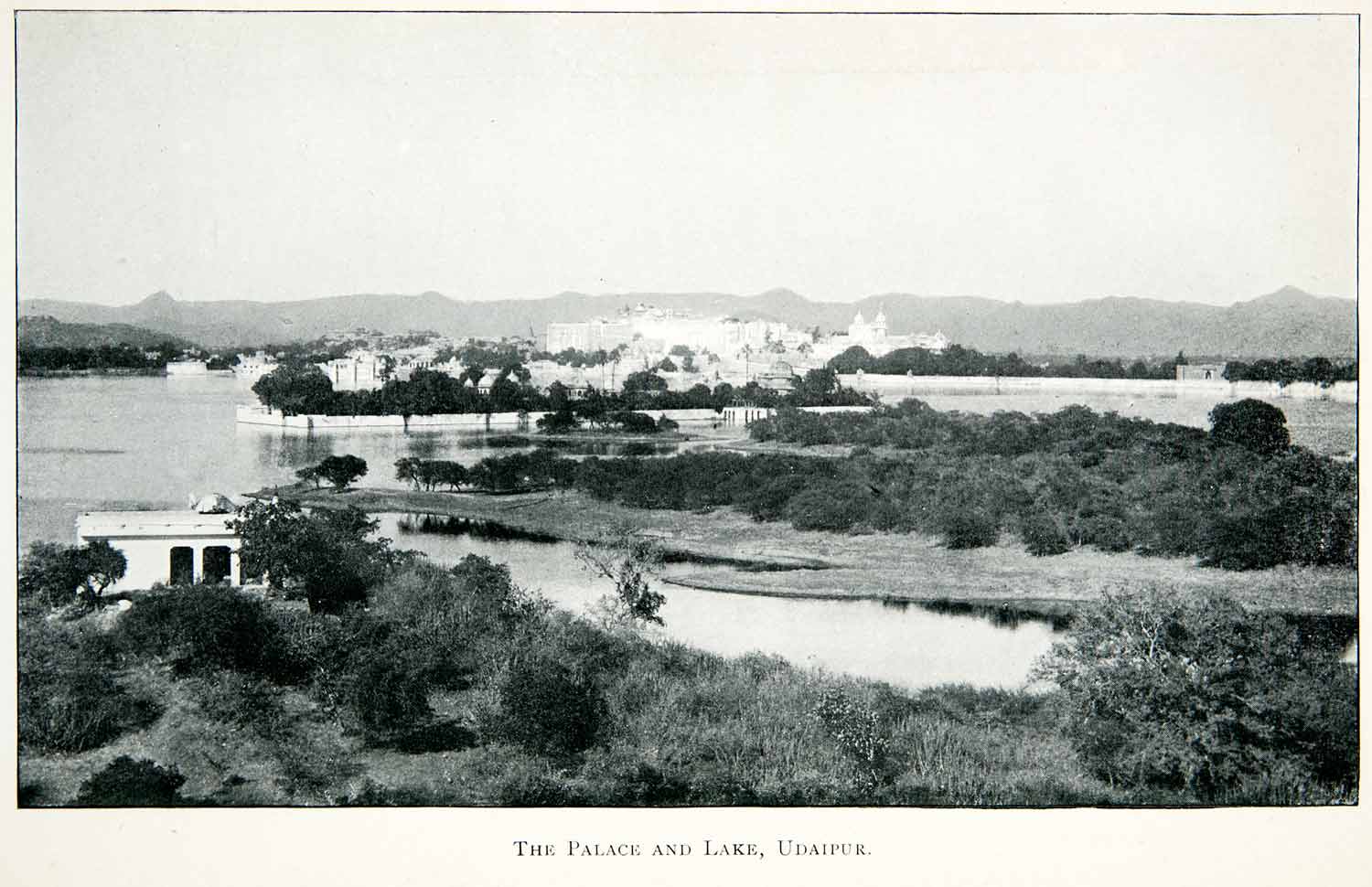 This is an original 1906 black and white halftone print of "The Palace and Lake, Udaipur," in India.