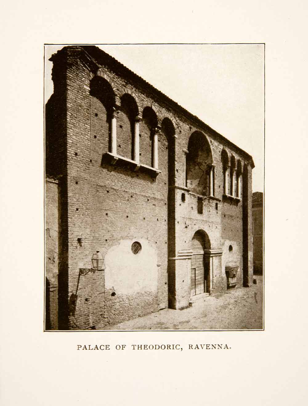 This is an original 1906 black and white halftone print of the Palace of Theodoric in Ravenna, Italy.