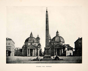 This is an original 1906 black and white halftone print of the Piazza del Popolo in Rome, Italy. In the foreground is the Egyptian obelisk of Ramesses II. In the distance the twin churches of Santa Maria in Montesanto and Santa Maria dei Miracoli are visible.
