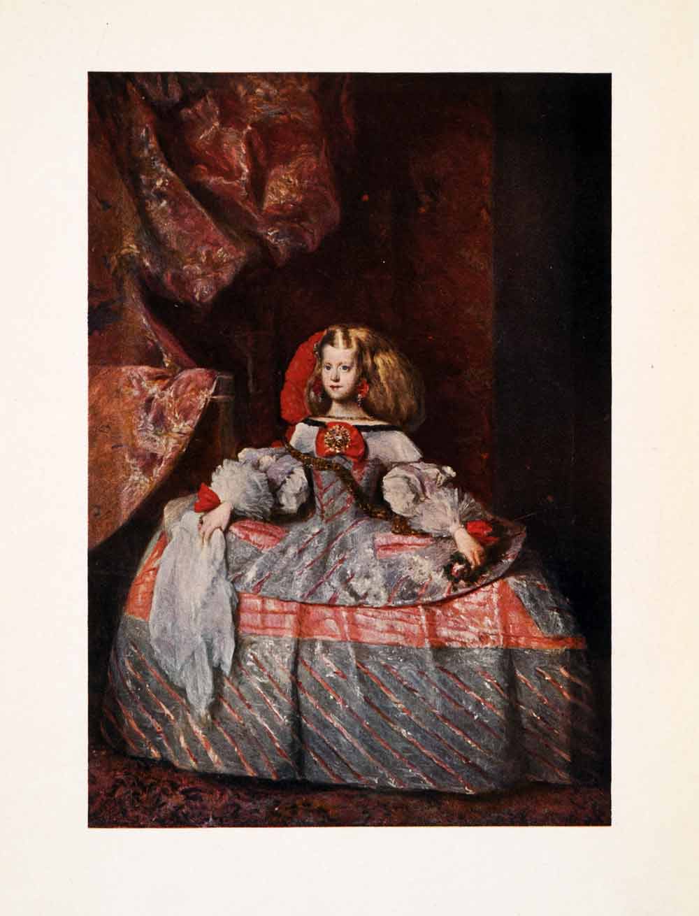 This is an original 1906 color print of Princess Margarita Maria (The Infanta in Red). Infanta is described as a daughter of a Spanish or Portuguese king. "There stands the little lady, a wonder of rose-pink and silver, half unwilling to be painted, half amused, pleased certainly with the clothes in which her maids have dressed her." -C. Lewis Hind.