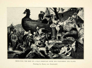 This is an original 1906 monochrome halftone print of a painting by Henry von Siemiradzki of a Slavic chieftain being cremated with his warhorse.
