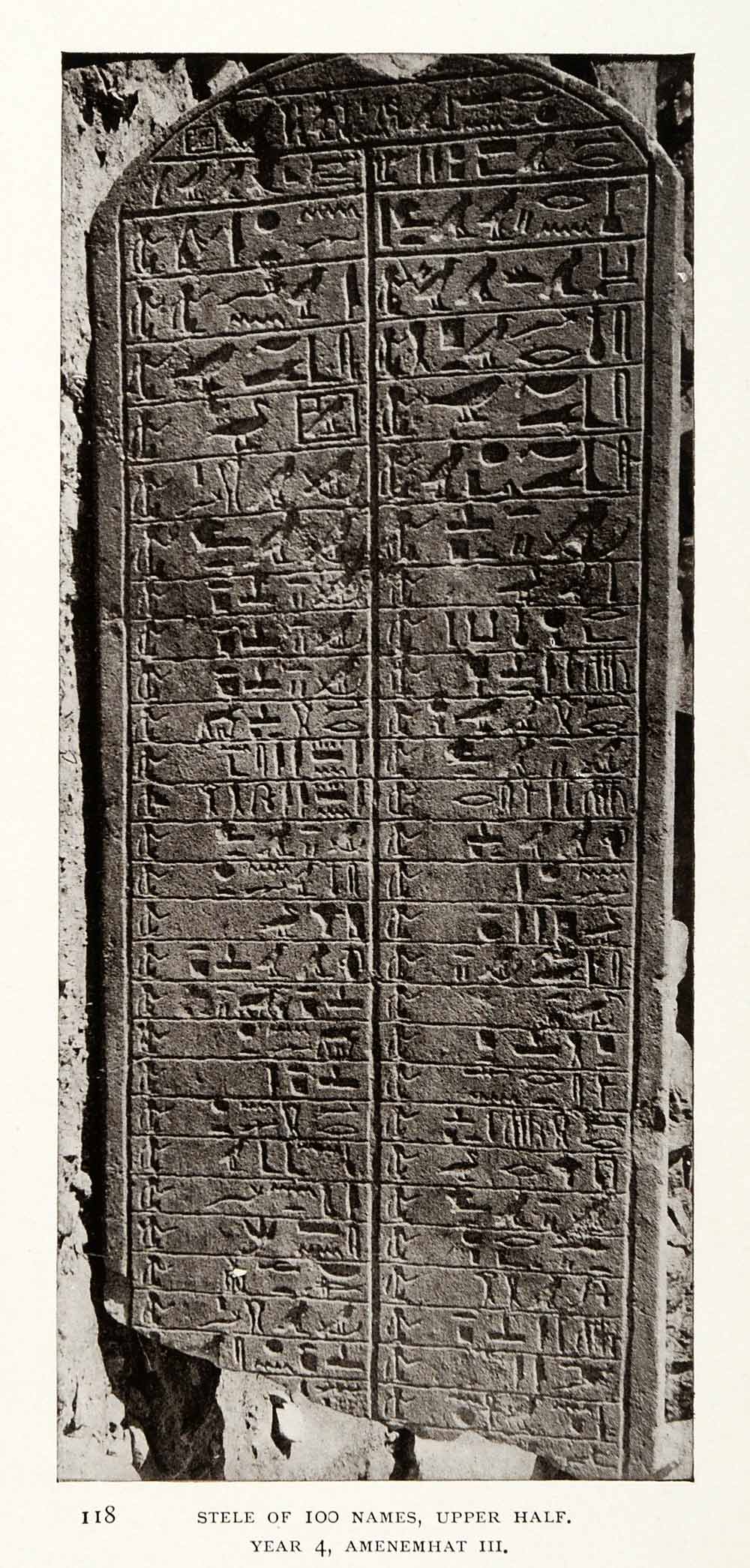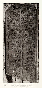 This is an original 1906 sepia halftone print of the upper half of the Stele of 100 Names, year 4, Amenemhat III; Sinai, Egypt.