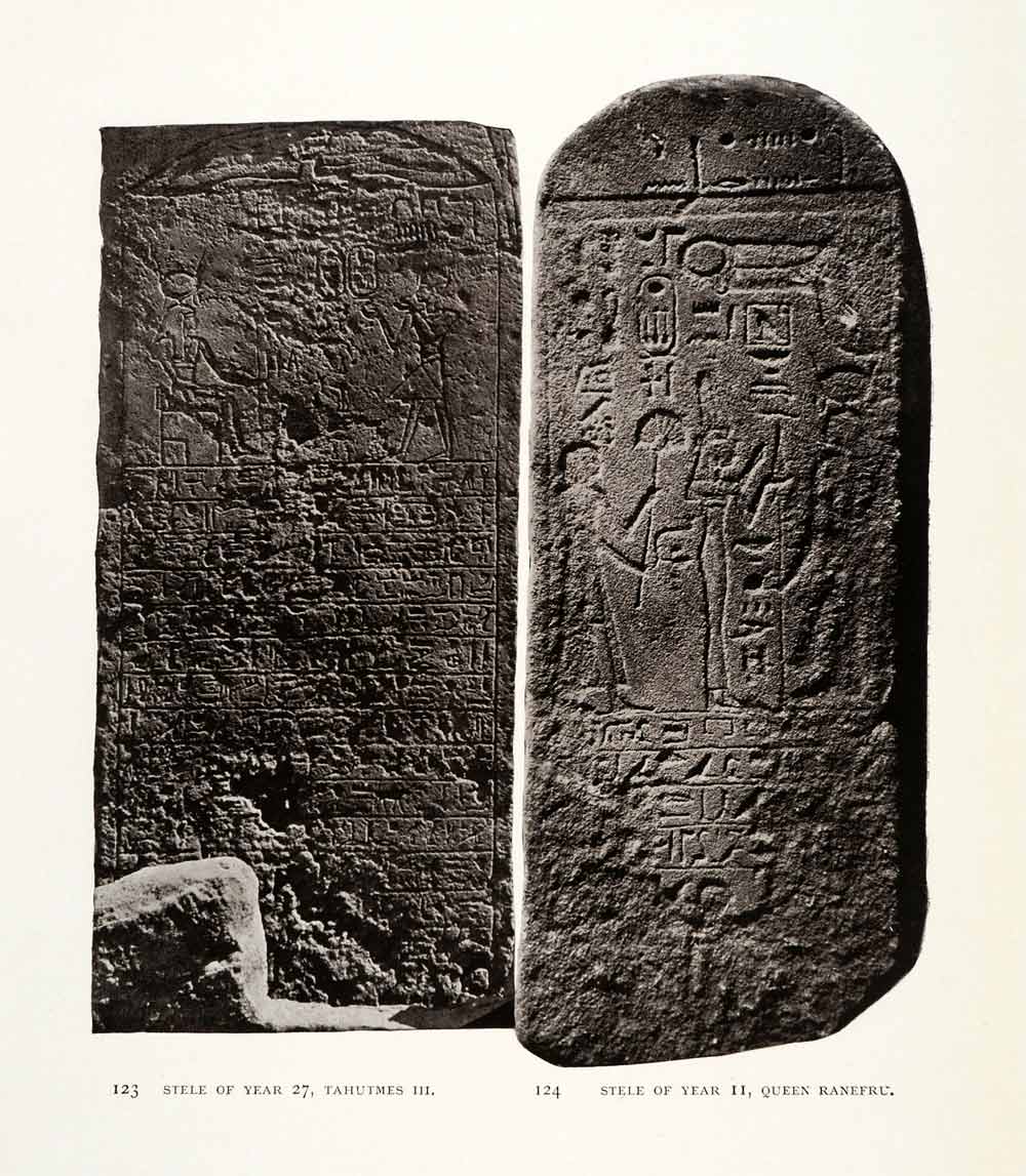 These are two original 1906 sepia halftone prints of the Stele of year 27, Tahuimes III, and the Stele of year II, Queen Ranefru; Sinai, Egypt.