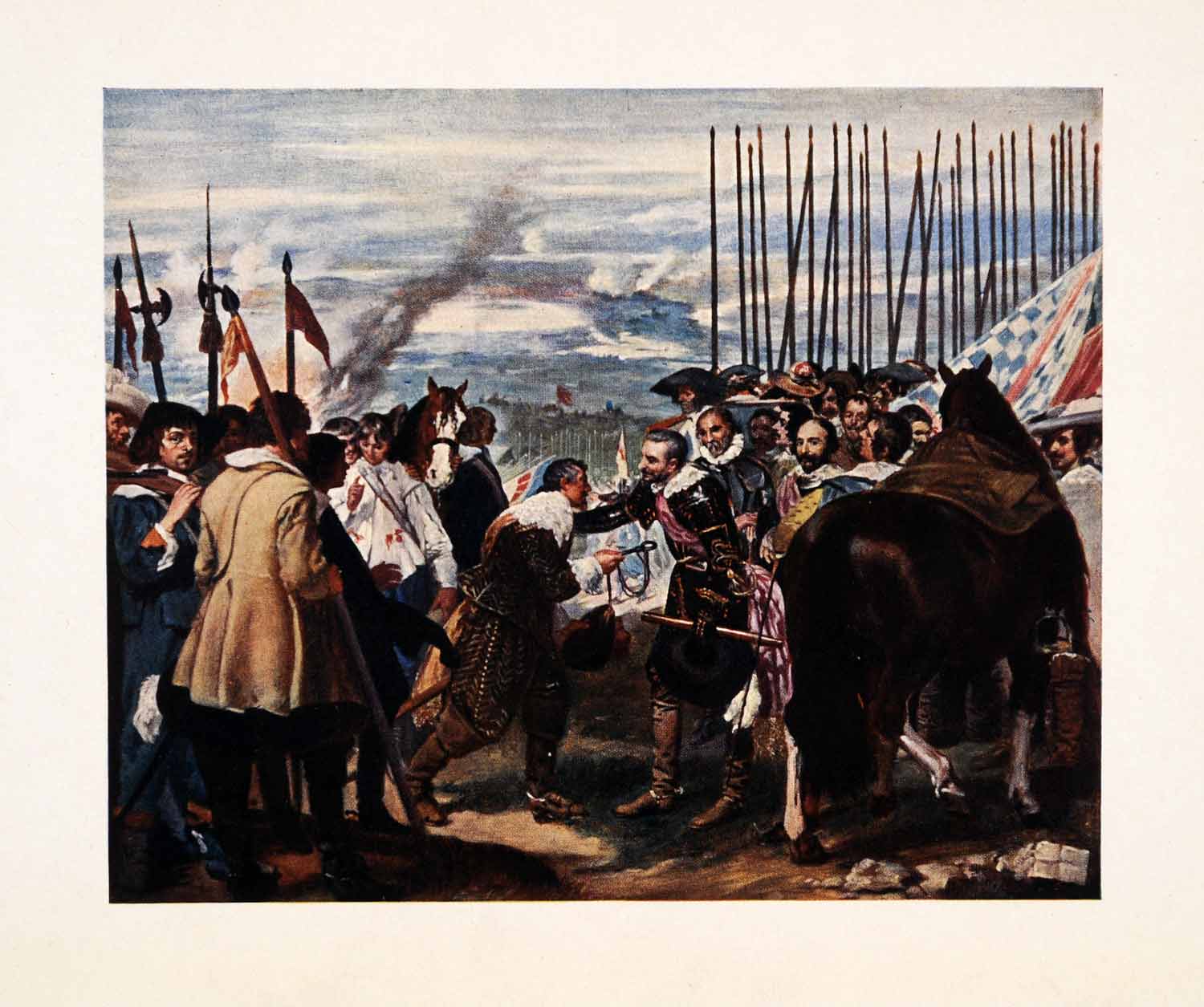 This is an original 1906 color print of the Spanish troops passing in the sunlight between the gracious bending form of Spinola and the figure of the Dutch Governor, Justin Nassau, who is delivering up the keys to the city.