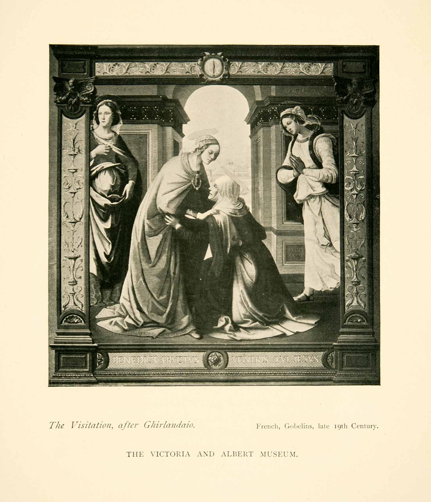 This is an original 1906 black and white halftone print of a tapestry "The Visitation, after Ghirlandaio" from the Victoria and Albert Museum located in the Cromwell Gardens, South Kensington, London.