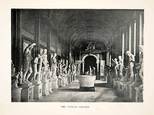 This is an original 1906 black and white halftone print of an interior view of the Vatican Gallery in Rome, Italy.