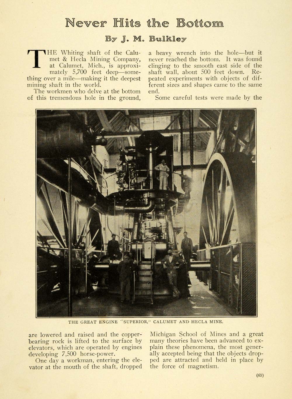 This is an original 1906 halftone print featuring the Whiting shaft of the Calumet & Hecla Mining Company, at Calumet, Michigan. This shaft was approximately a 5,700 feet deep and was considered the deepest mining shaft in the world