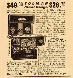 This is an original 1906 black and white print ad for the Tolman Steel Range from the Judson A. Tolman Company, 66 Lake Street, Chicago.