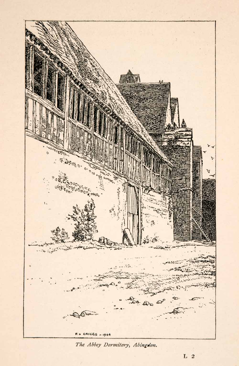 This is an original 1906 black and white in-text wood engraving of the dormitory at the Abbey in Abingdon, Oxfordshire, England. Until the 1974 boundary change this city was a part of Berkshire. Abingdon is England's oldest continusously occupied town.