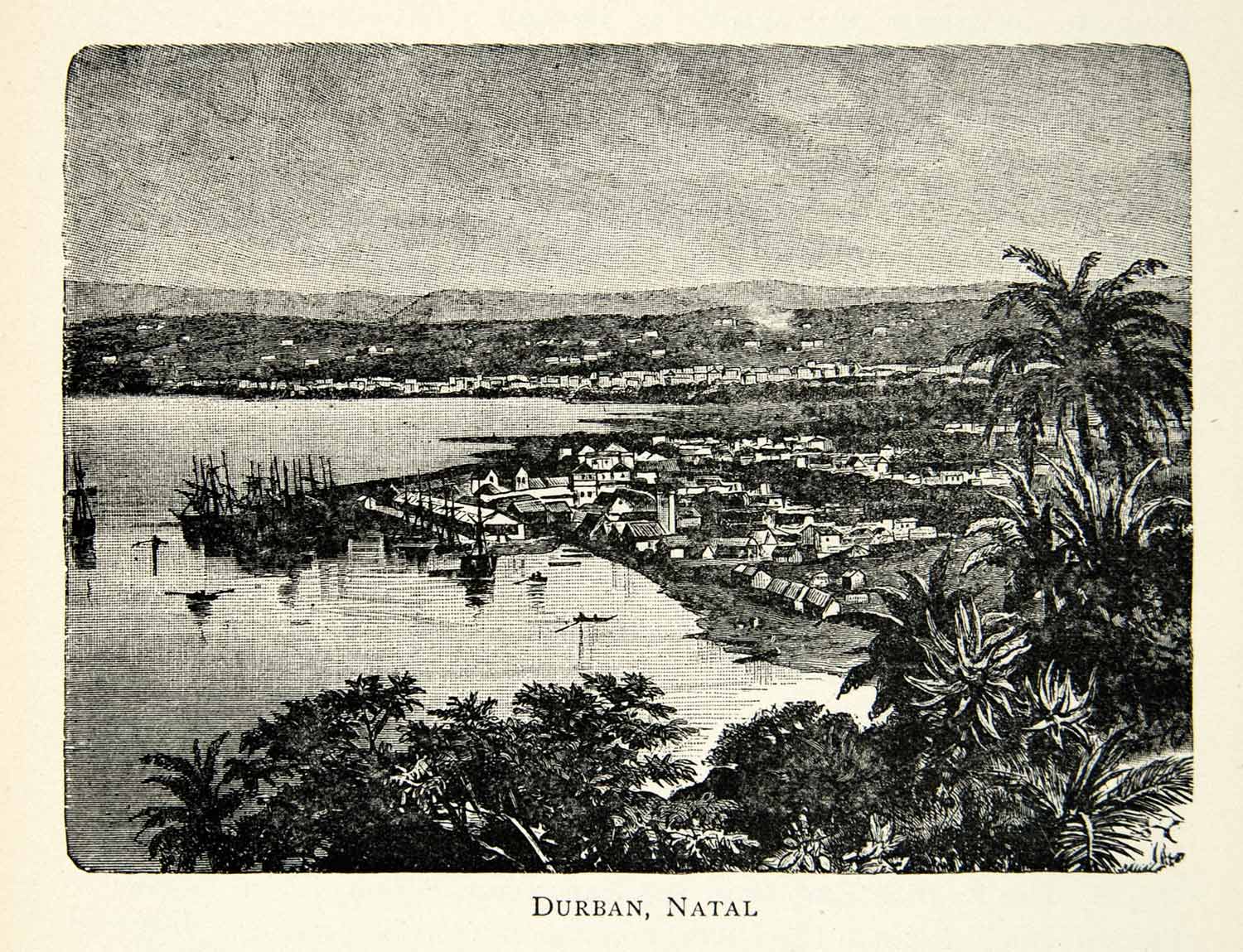 This is an original 1906 black and white in-text wood engraving of the city of Durban in the South Africa Province of KwaZulu-Natal.