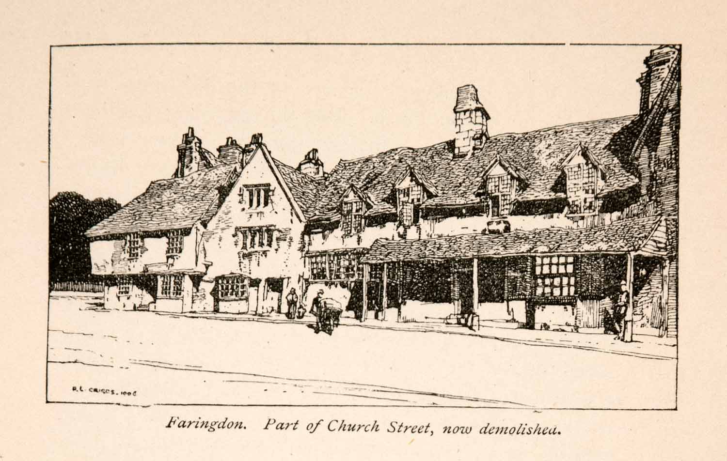 This is an original 1906 black and white in-text wood engraving of Faringdon, Oxfordshire, England. Until the 1974 boundary change this city was a part of Berkshire. Faringdon was the first fairtrade town in the South East of England.