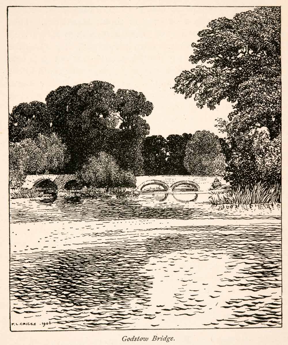 This is an original 1906 black and white in-text wood engraving of the Godstow Bridge that carries traffic over the River Thames in England.