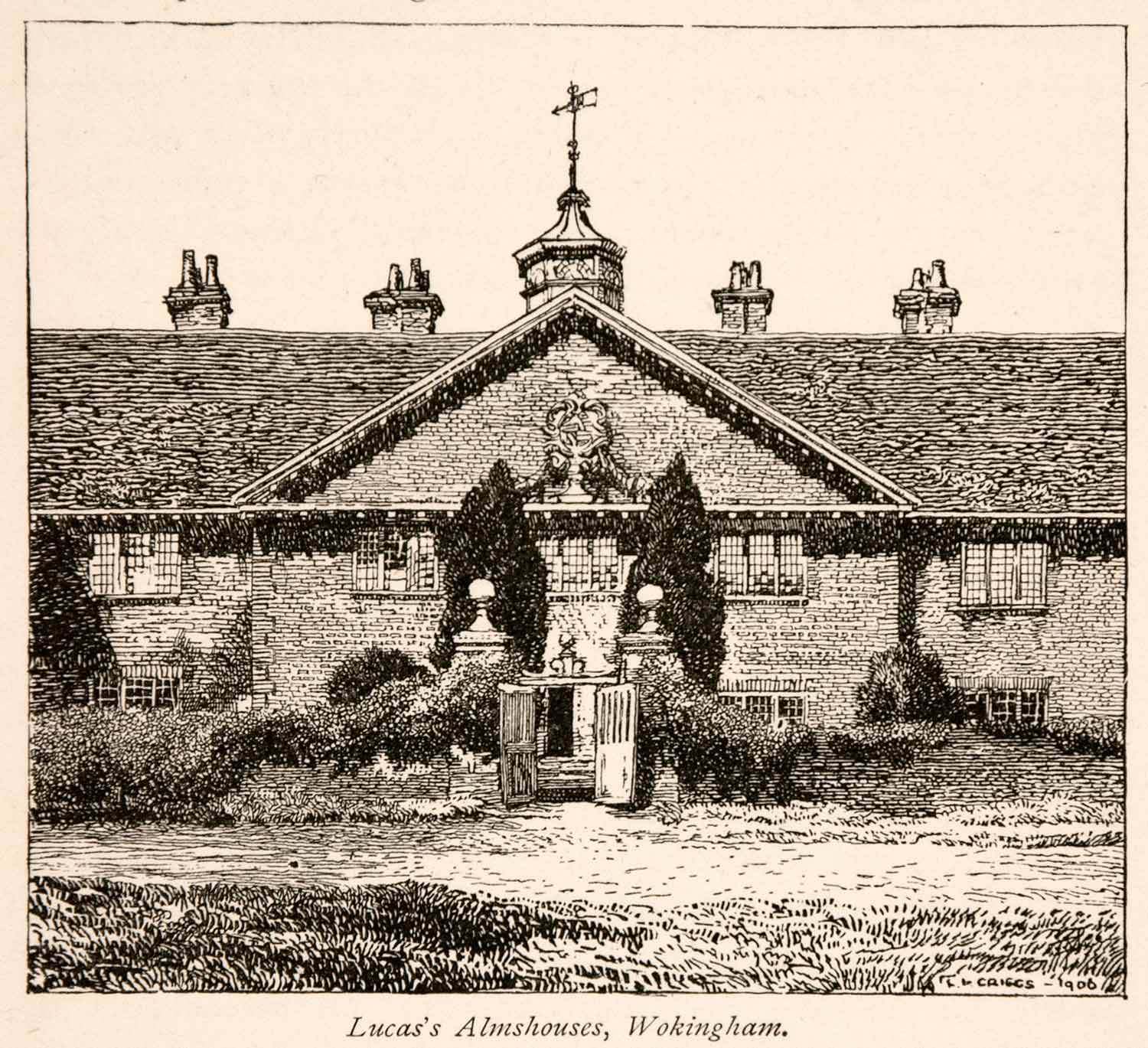 This is an original 1906 black and white in-text wood engraving of Lucas's Almshouse in Workingham, England. An Almshouse is a charitable housing unit provided to enable people who are poor or elderly into this community.