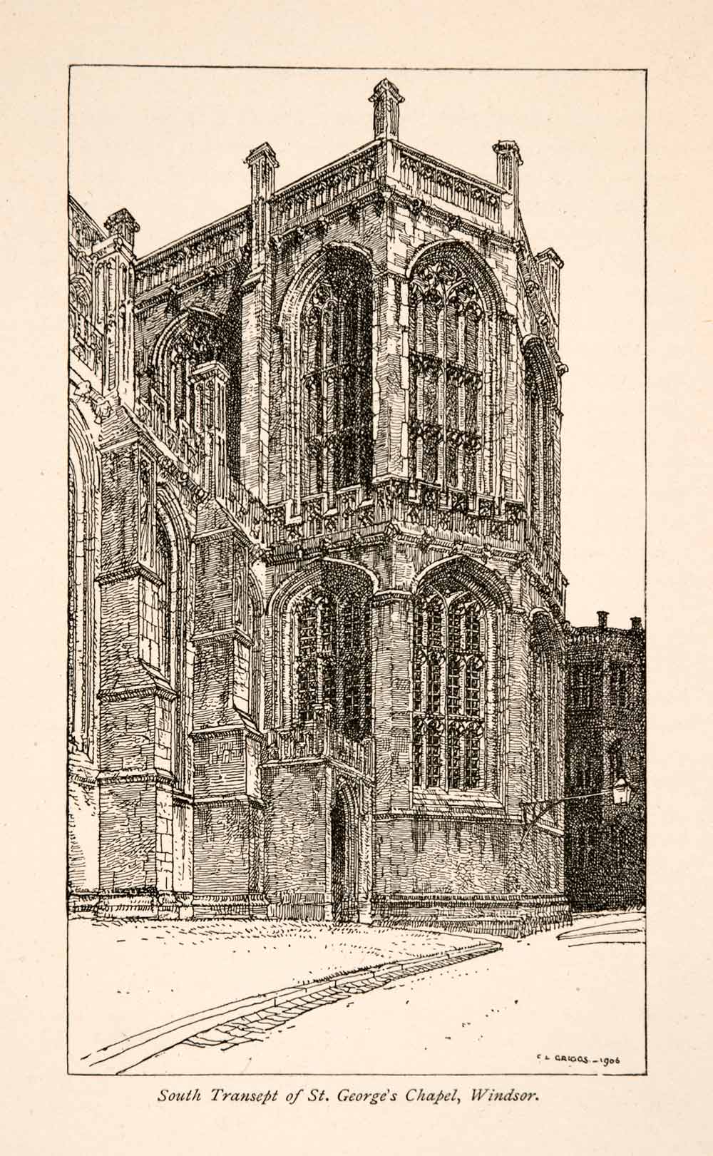 This is an original 1906 black and white in-text wood engraving of the south transept of Saint George's Chapel in Windsor, Berkshire, England. The transept is a transverse section of a building which lies across the main body of the building.