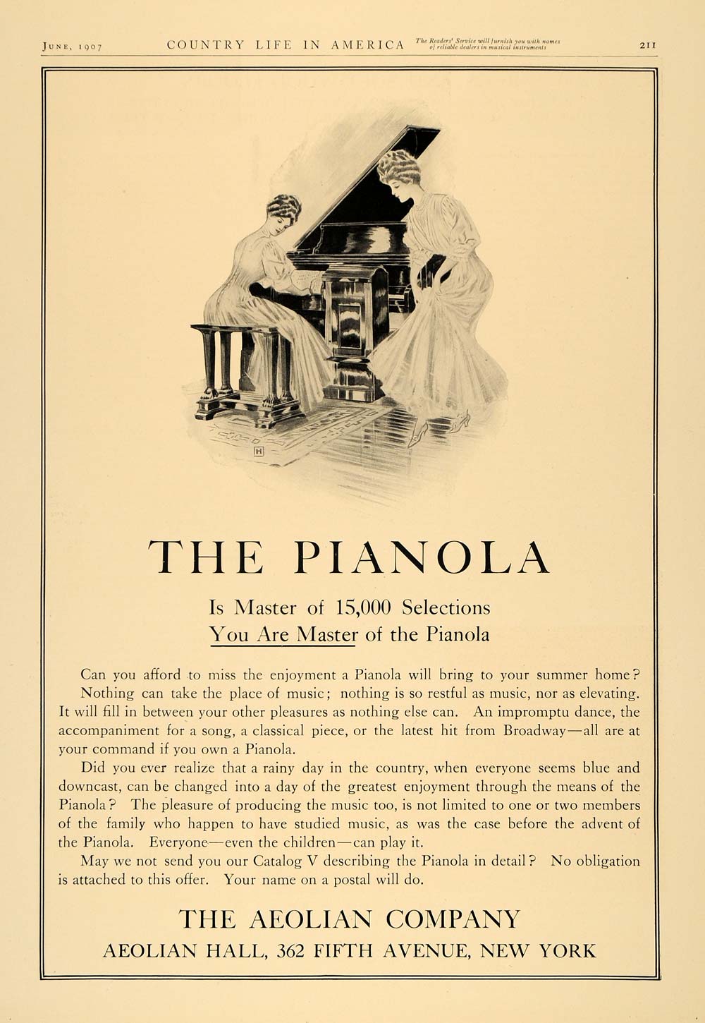 This is an original 1907 black and white print ad for The Aeolian Company's Pianola Piano.