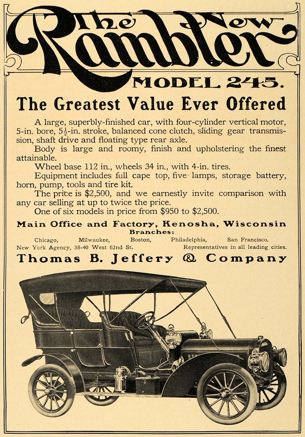 This is an original 1907 black and white print ad for The New Rambler Model 245, a product by Thomas B. Jeffery and Company in Kenosha, Wisconsin.