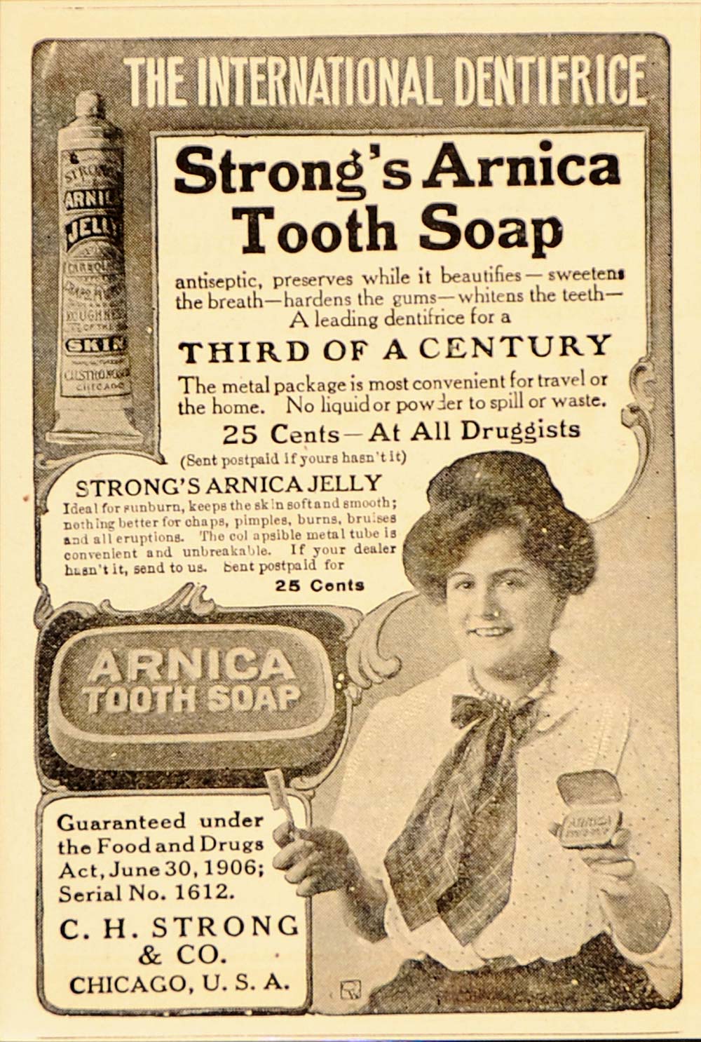 This is an original 1907 black and white print ad for Strong's Arnica Tooth Soap from C. H. Strong & Co., Chicago.
