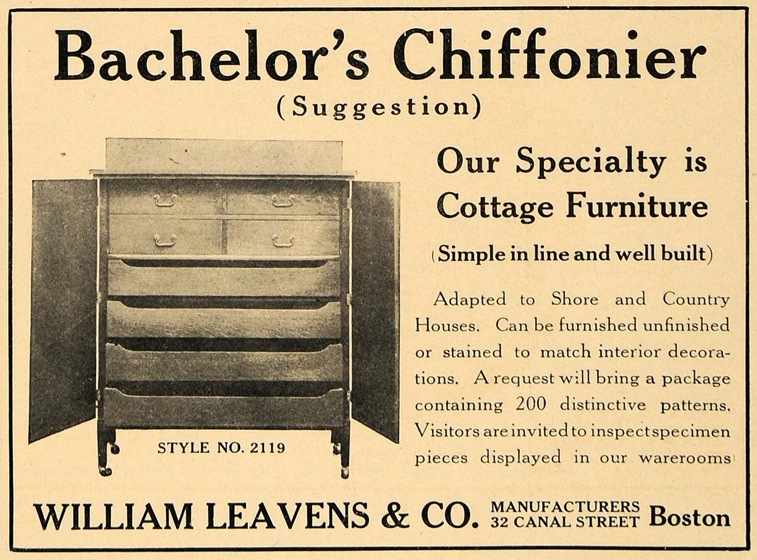 This is an original 1907 black and white print ad for a Bachelor's Chiffonier (style no. 2119) by William Leavens and Company located at 32 Canal Street, Boston, Massachusetts.