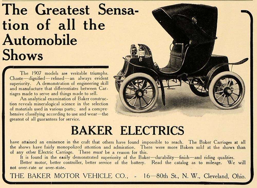 This is an original 1907 black and white print ad for the Baker Motor Vehicle Company, featuring its new electric carriage model.
