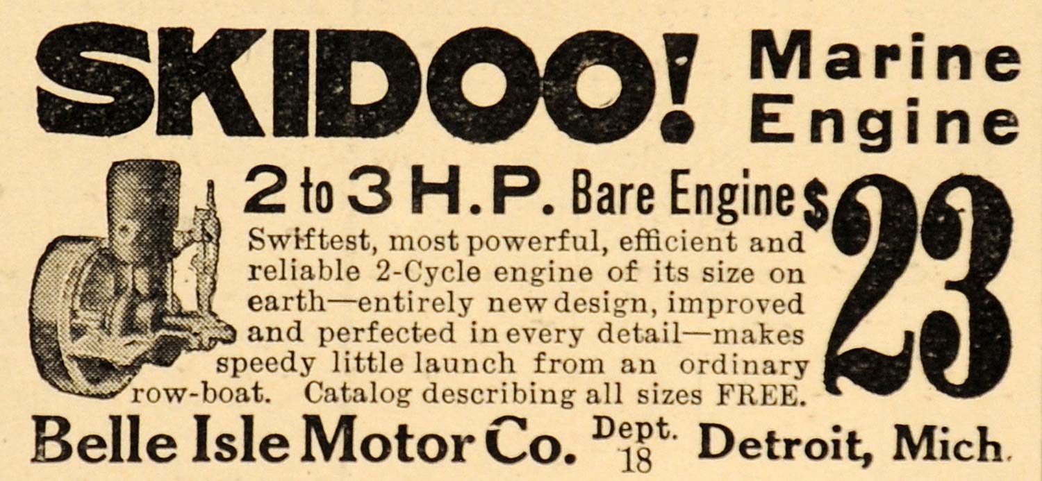 This is a tiny original 1907 black and white print ad for the Skidoo Marine Engine from Belle Isle Motor Company located in Detroit, Michigan.