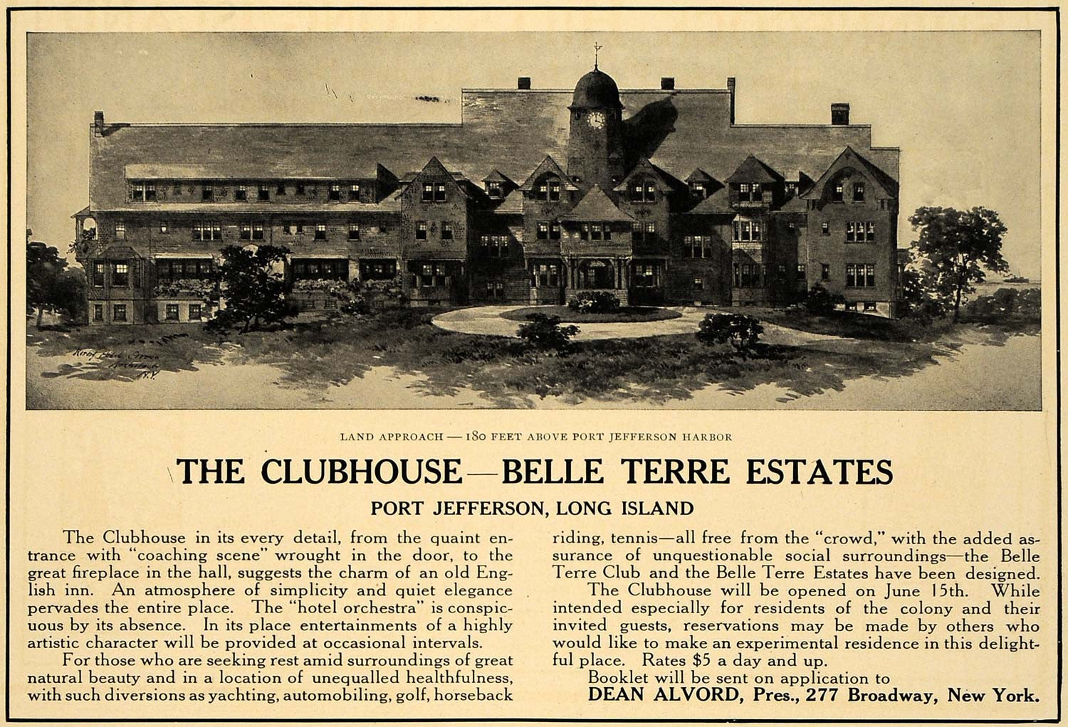 This is a rare original 1907 black and white print ad for The Clubhouse, Belle Terre Estates, located on Port Jefferson in Long Island.