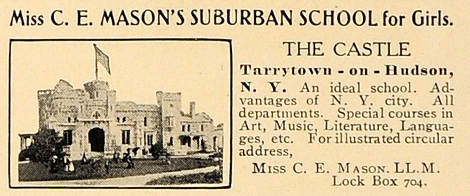 This is an incredible original 1907 black and white print ad for Miss C.E. Mason's Suburban School for Girls, located at Tarrytown-on-Hudson in New York.