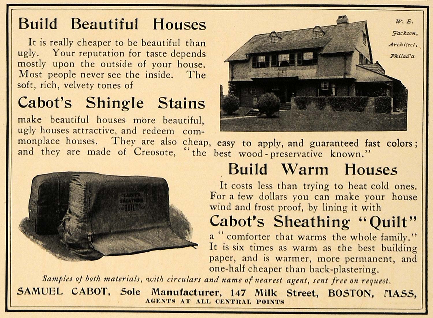 This is an original 1907 black and white print ad for Samuel Cabot's Sheathing Quilt. This ad features a building designed by architect W.E. Jackson with Cabot's Sheathing "Quilt" and Roof Shingle Stain. Today, most homes and buildings are constructed with Tyvek House Wrap; however, 100 years ago, the go-to name was Cabot's Sheathing Quilt.