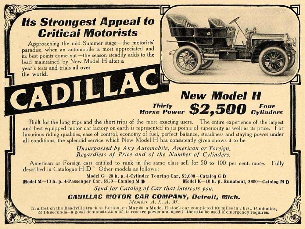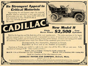 This is an original 1907 black and white print ad for the Cadillac Model H automobile.