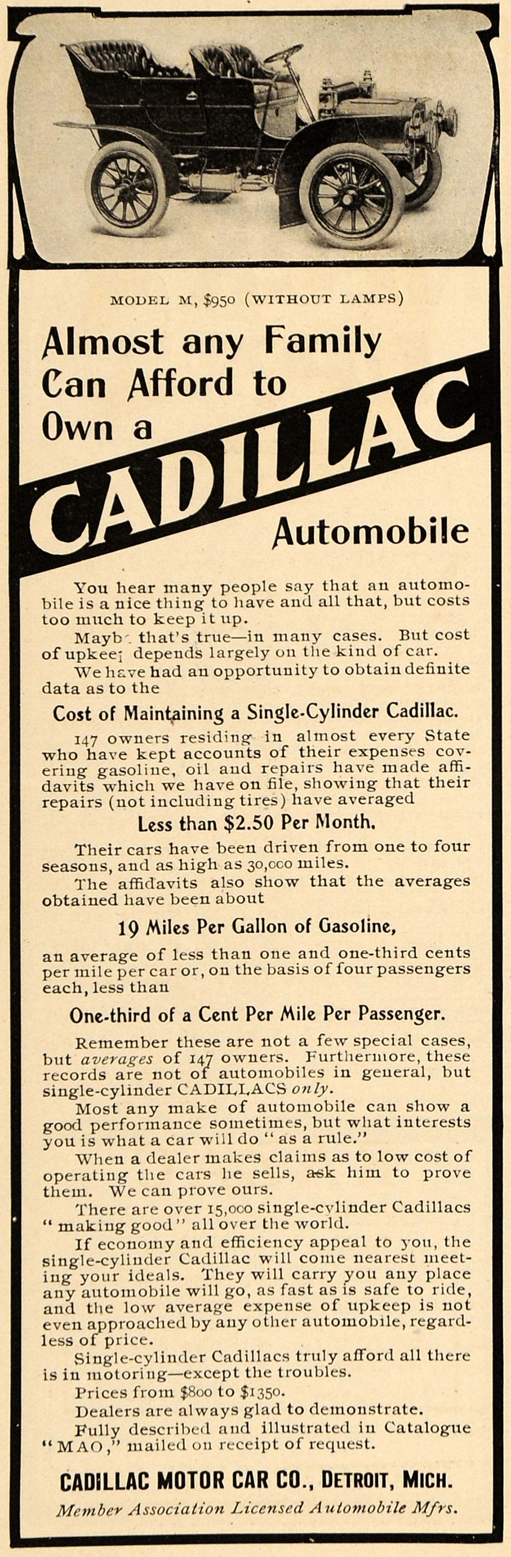 This is a small original 1907 black and white print ad for the Cadillac Motor Car Company of Detroit, Michigan. The ad features an image of the Model M-- selling for $950.