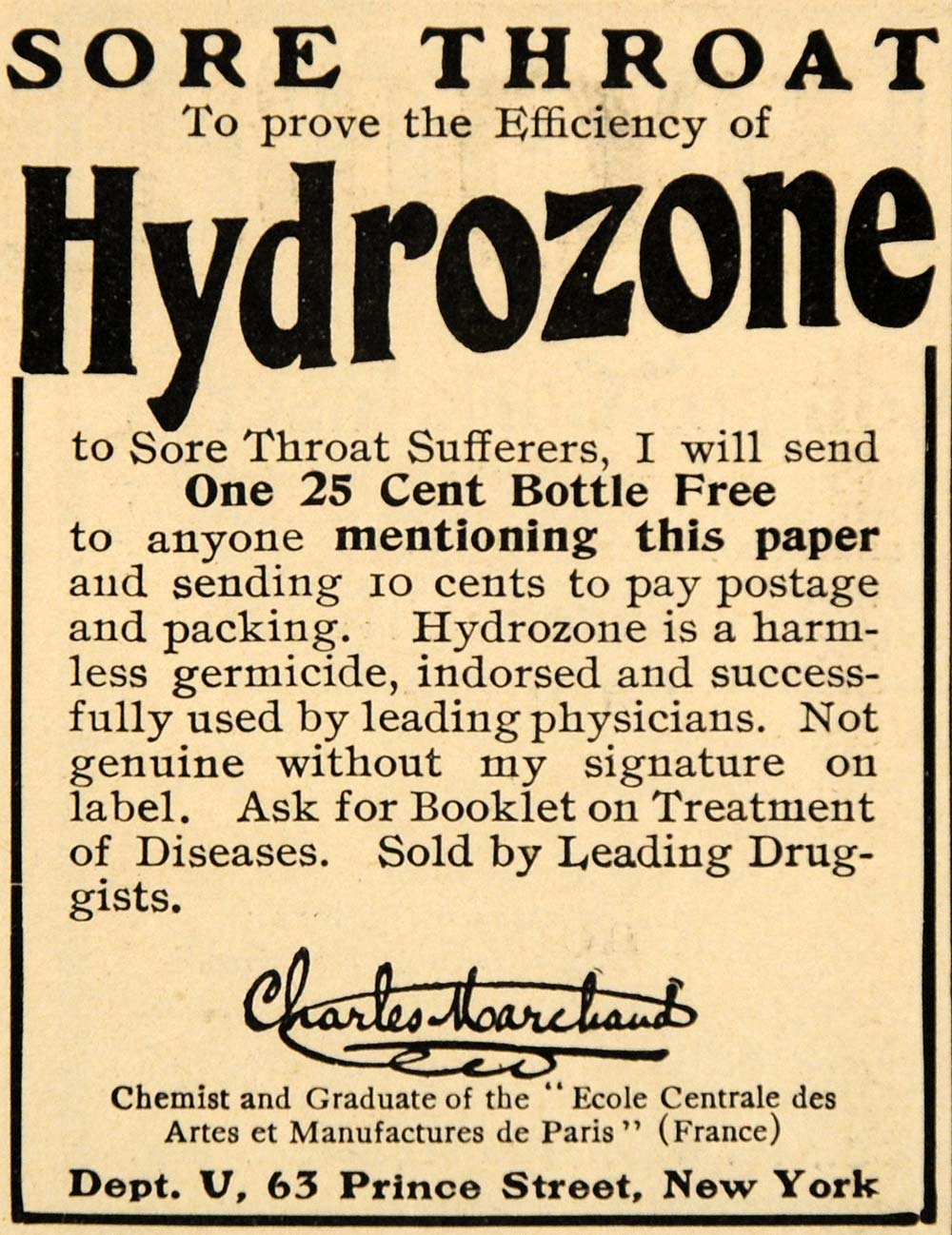 This is a small original 1907 black and white print ad for Hydrozone, 63 Prince Street, New York.