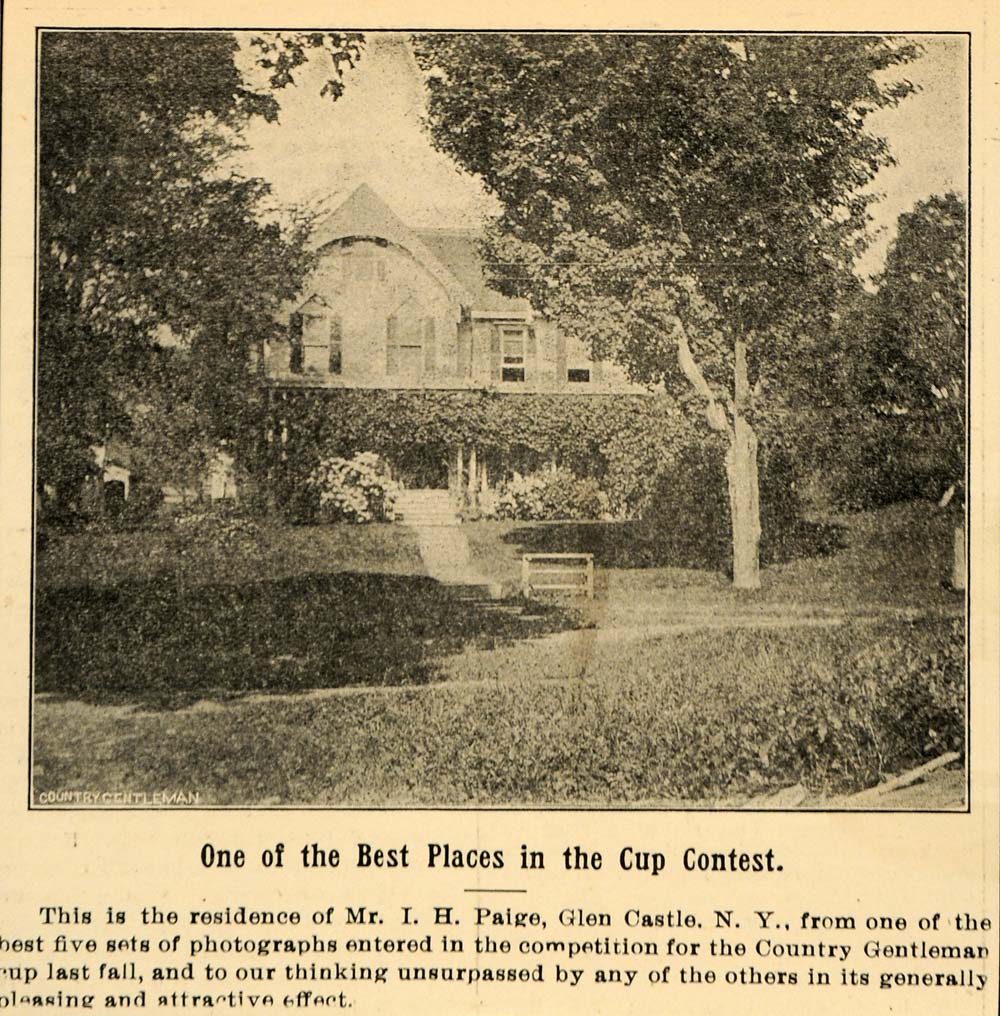 This is an original 1907 black and white print ad for the Country Gentleman's Cup Contest. The ad has a picture of Mr. I. H. Paige's residence in Glen Castle, New York.