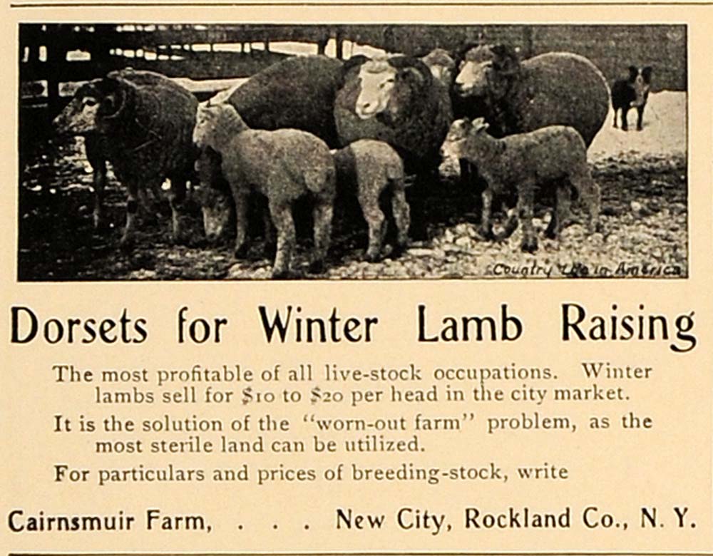 This is an original 1907 black and white print ad for Cairnsmuir Farm's Dorset Winter Lambs.