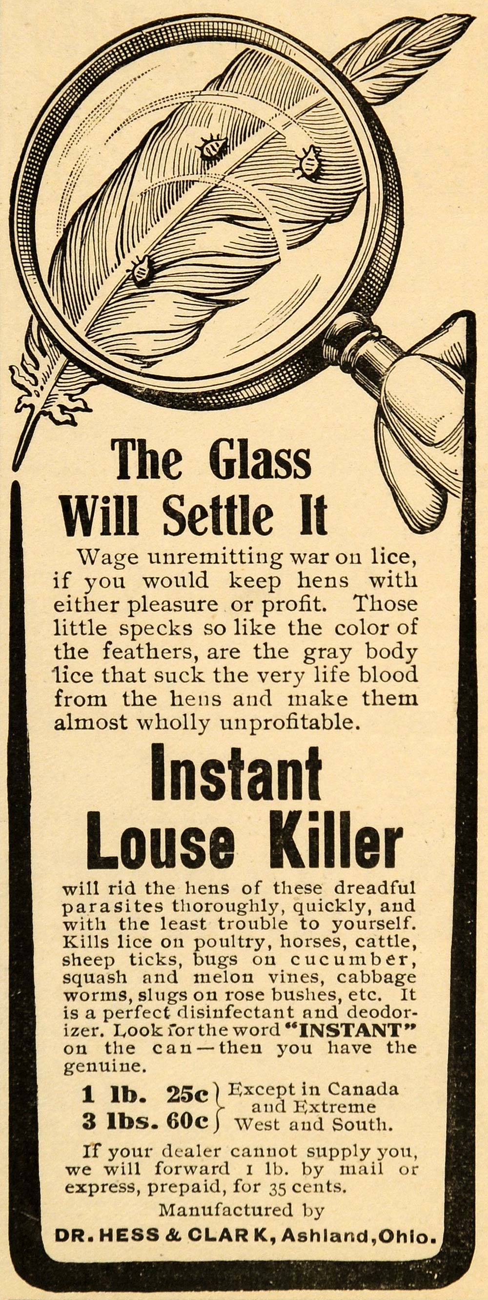 This is a small original 1907 black and white print ad for Instant Louse Killer by Dr. Hess & Clark of Ashland, Ohio.