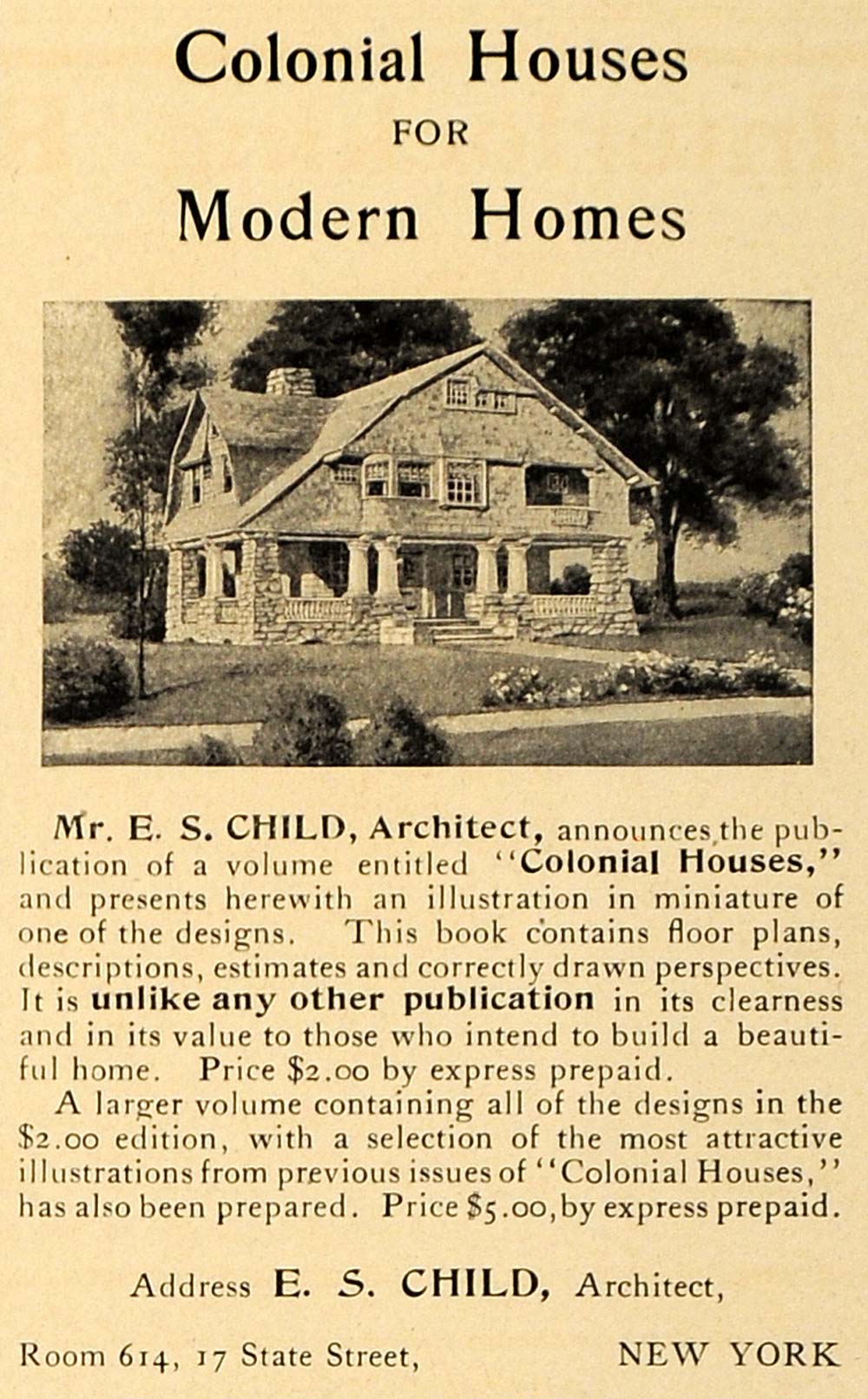 This is an original 1907 black and white print ad for E. S. Child's Colonial Houses architecture booklet.