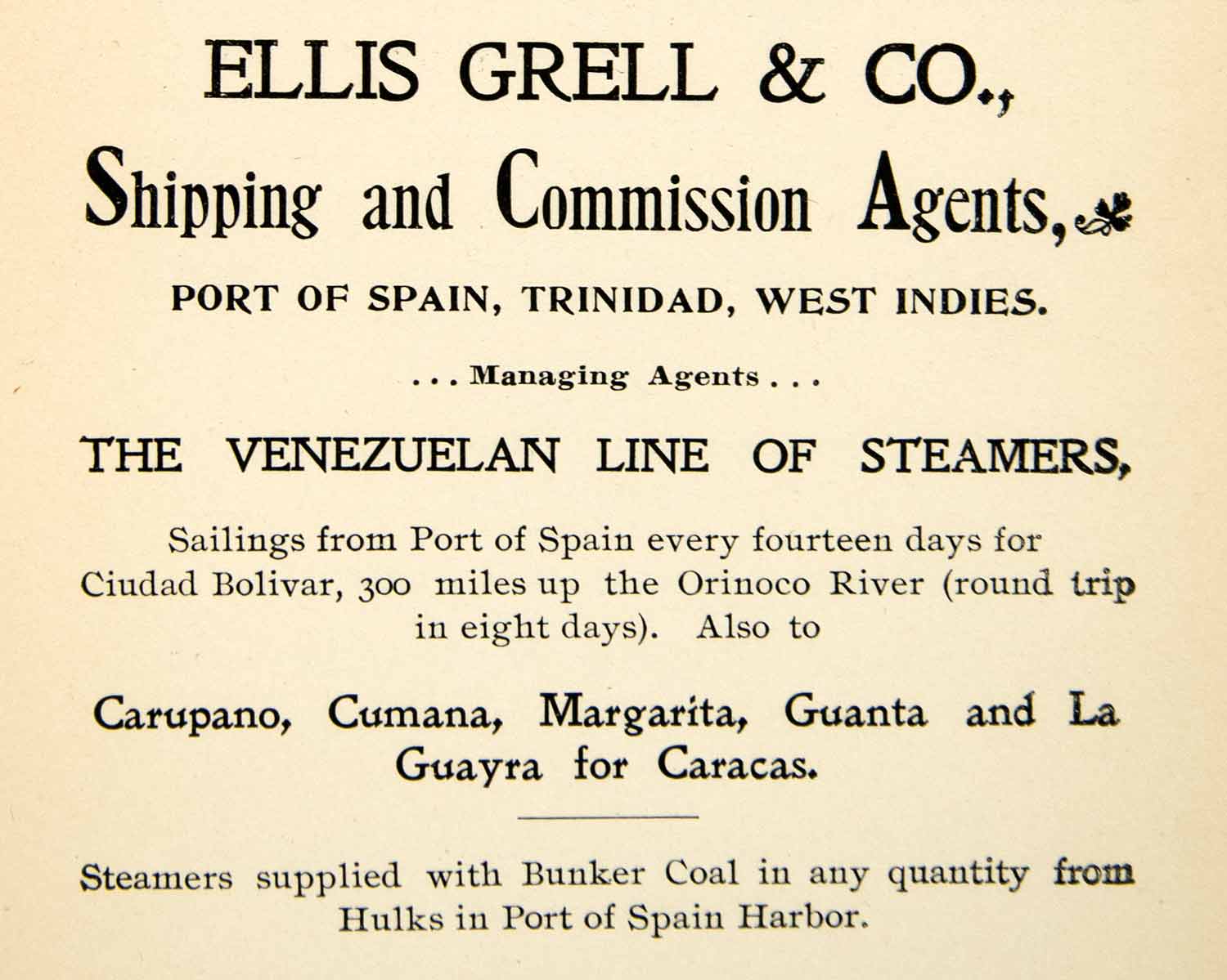 This is an original 1907 black and white print ad for Ellis Grell & Company, Shipping and Commission Agents operating out of the Port of Spain, Trinidad, West Indies through the Venezuelan Line of Steamers.