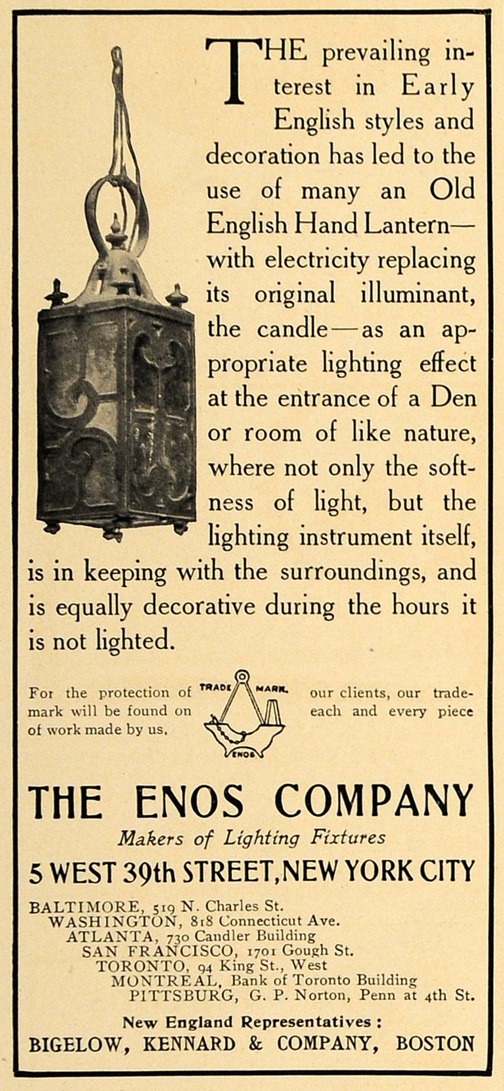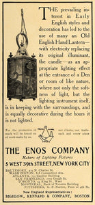 This is an original 1907 black and white print ad for The Enos Company, specially featuring an Old English Hand Lantern.