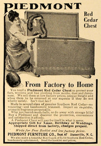 This is an original 1907 black and white print ad for the Piedmont Red Cedar Chest by the Piedmont Furniture Company located in Statesville, North Carolina.