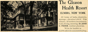 This is an original 1907 black and white print ad for The Gleason Health Resort from Dr. John C. Fisher and Edward B. Gleason located in Elmira, New York.