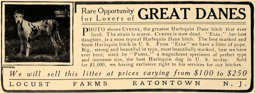 This is an original 1907 black and white print ad for Great Danes by Locust Farms located in Eatontown, New Jersey.