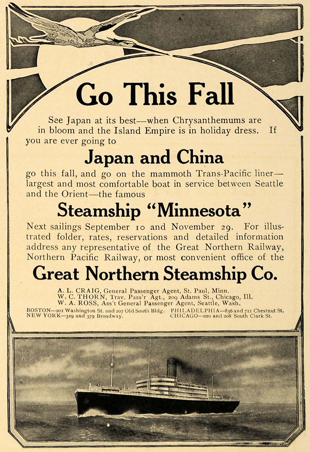 This is an original 1907 black and white print ad for the Great Northern Steamship Company, featuring travel to Japan and China under the steamship "Minnesota."