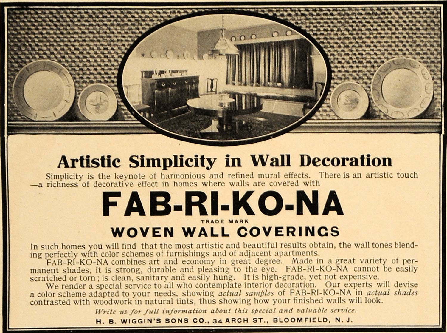 This is an original 1907 black and white print ad for the FAB-RI-KO-NA Woven Wall Coverings from H. B. Wiggin's Sons Company located at 34 Arch Street, Bloomfield, New Jersey.