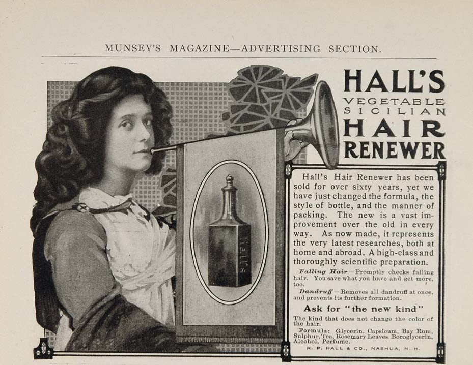 This is an original 1907 black and white print ad for Hall's Vegetable Sicilian Hair Renewer from R. P. Hall & Co., Nashua, New Hampshire.