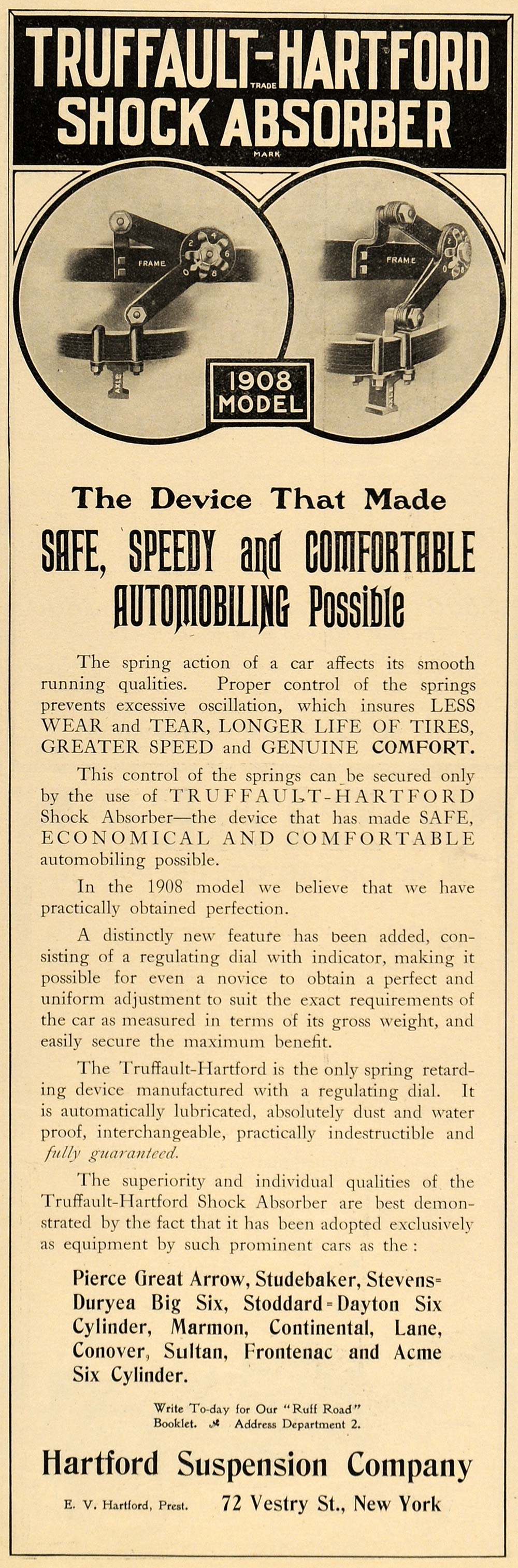 This is an original 1907 black and white print ad for the Truffault-Hartford Schock Absorber, a product by the Hartford Suspension Company, located at 72 Vestry Street in New York.