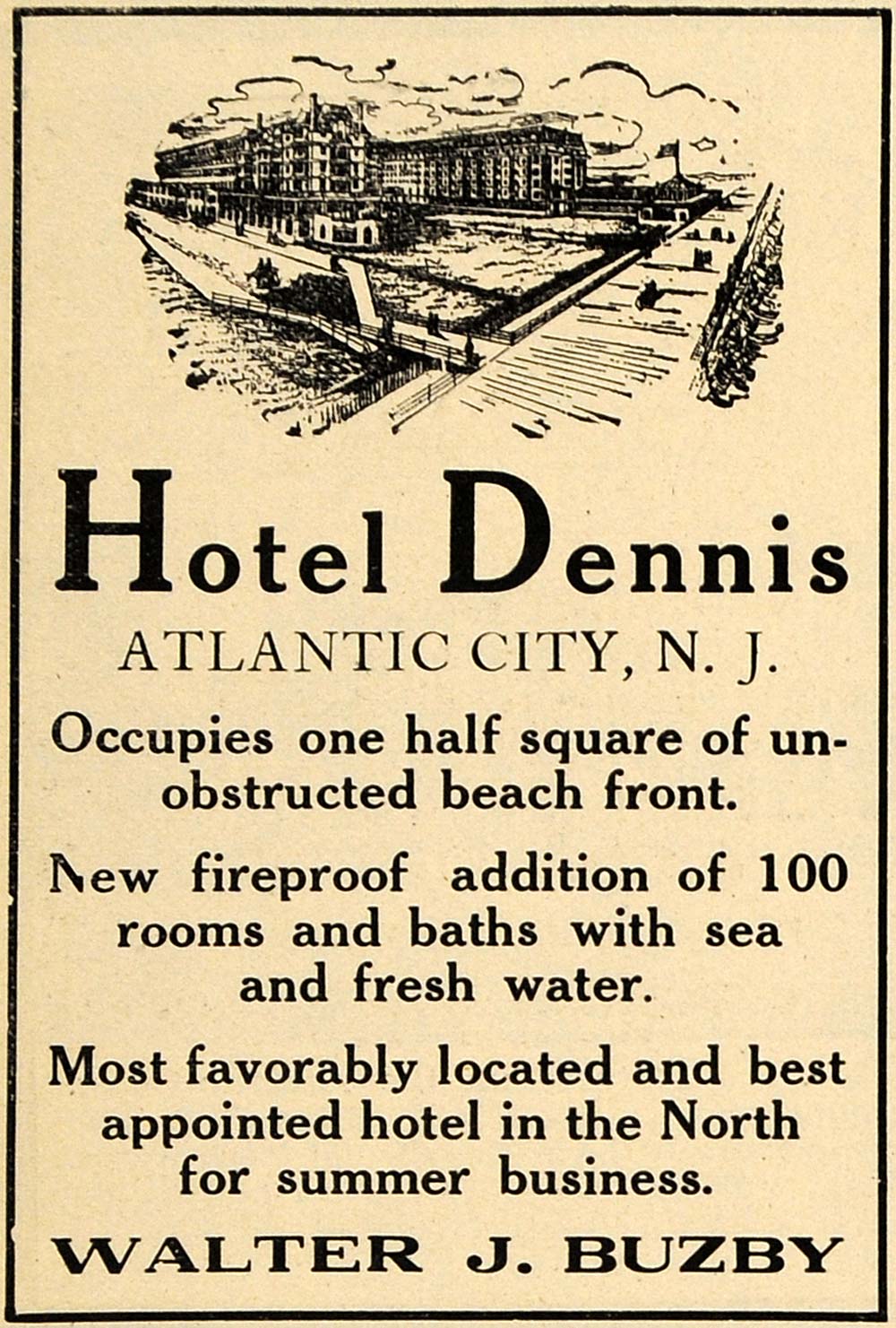 This is an original 1907 black and white print ad for Hotal Dennis located in Atlantic City, New Jersey.