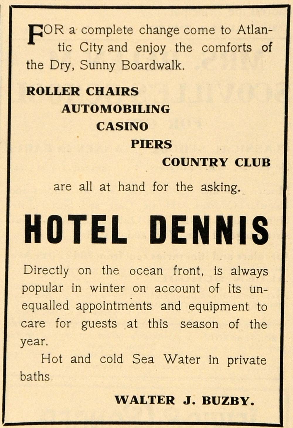 This is an original 1907 black and white print ad for the Hotel Dennis, located on the ocean front of Atlantic City, property of Walter J. Buzby.