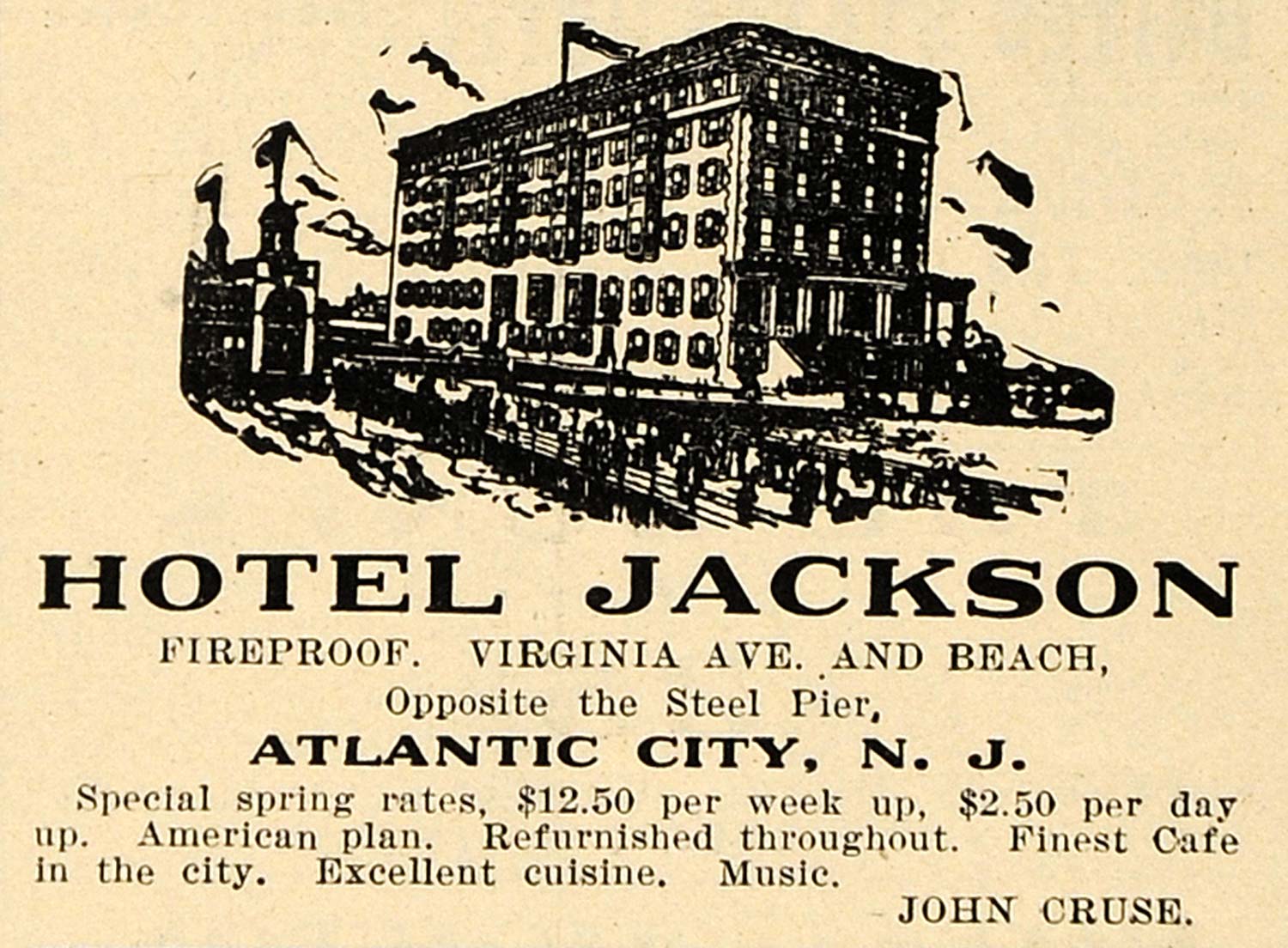 This is an original 1907 black and white print ad for Hotel Jackson located on Virginia Ave. and Beach in Atlantic City, New Jersey.
